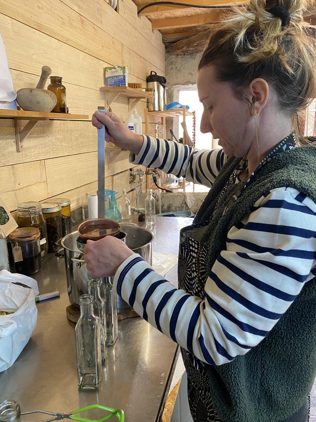 Je transforme tous les produits sur place de manière artisanale. La cueillette des plantes est entièrement réalisée à la main et la production est certifiée en Agriculture Biologique.